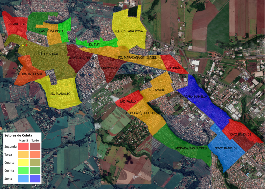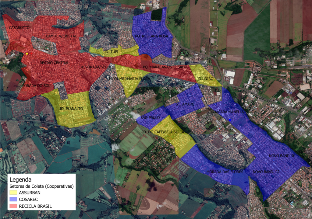 A coleta seletiva porta a porta é realizada uma vez por semana, nas áreas de abrangência dos contratos das cooperativas, Recicla Brasil, Corasec e Assurban.