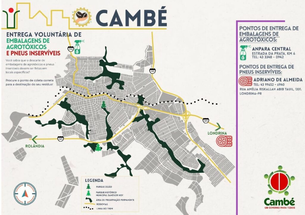Mapa gráfico dos pontos de entrega voluntária de embalagens de agrotóxicos e pneus inservíveis em Cambé.