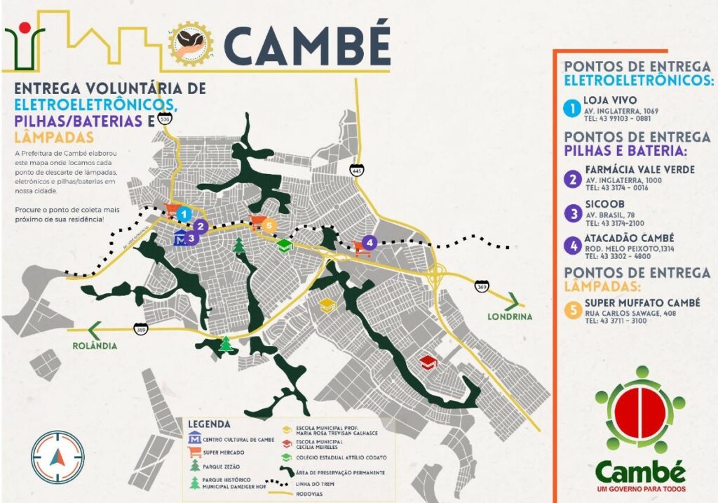 Mapa gráfico dos pontos de entrega voluntária de eletroeletrônicos, pilhas, baterias e lâmpadas em Cambé.