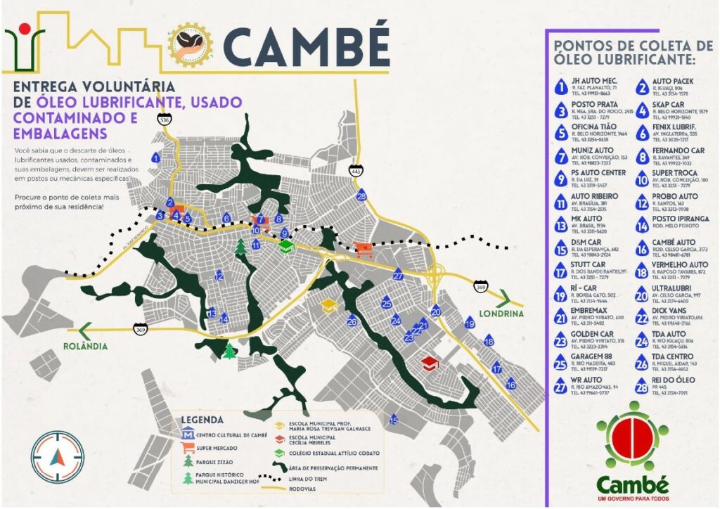 Para o óleo de cozinha, a SAMA possui uma parceria com a Imcopa (Indústria de produção de óleo vegetais), que forneceu um banner informativo e bombonas para o armazenamento de óleo usado da população cambeense na própria sede da secretaria, localizada na Rua Francisco Delgado Sanches, nº 189, Jardim Vitória. Posteriormente, o óleo coletado é destinado às Cáritas Arquidiocesana de Londrina, que possui o Projeto Óleo Solidário, que na sequência é vendido à empresa ITA Resíduos, especializada na gerência do material. Todo valor arrecadado é revertido para os projetos da entidade.