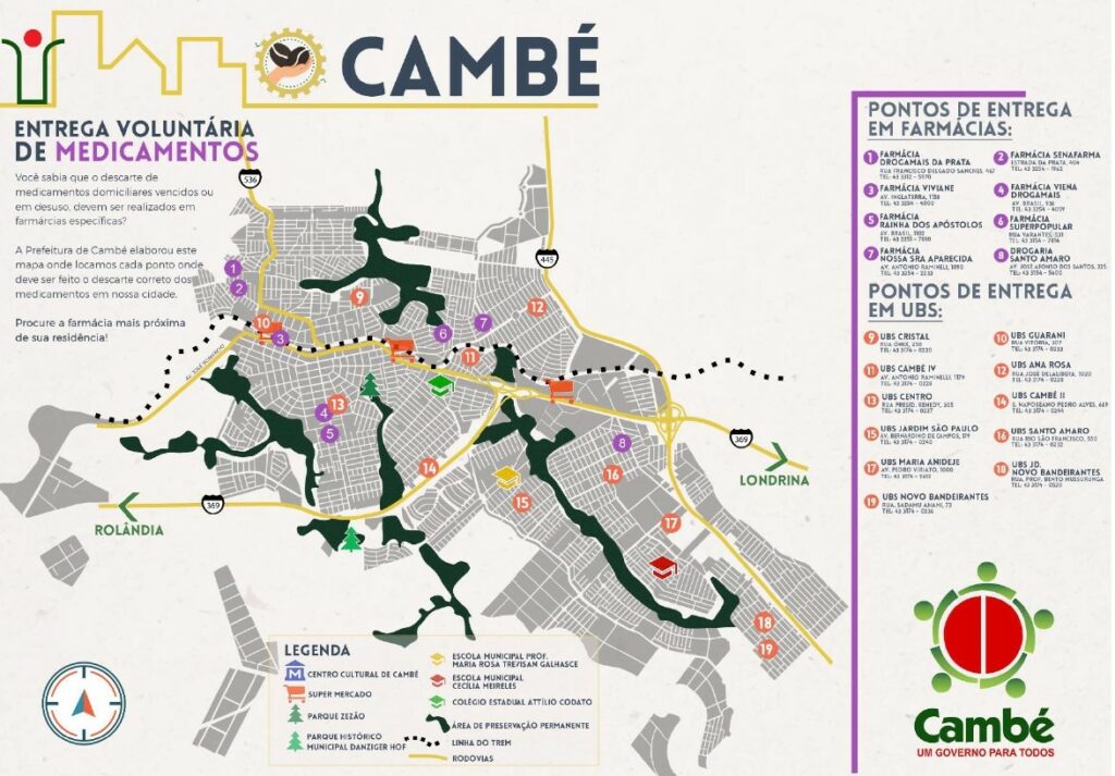 Mapa gráfico dos pontos de entrega voluntária de embalagens de medicamentos e medicamentos vencidos em Cambé.